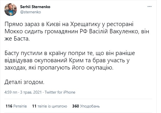 Российский рэп-исполнитель Баста (Василий Вакуленко — ред.), которому ранее запрещали, а впоследствии позволили въезжать в Украину из-за незаконного посещения оккупированного Крыма, 3 мая находится в Киеве.
