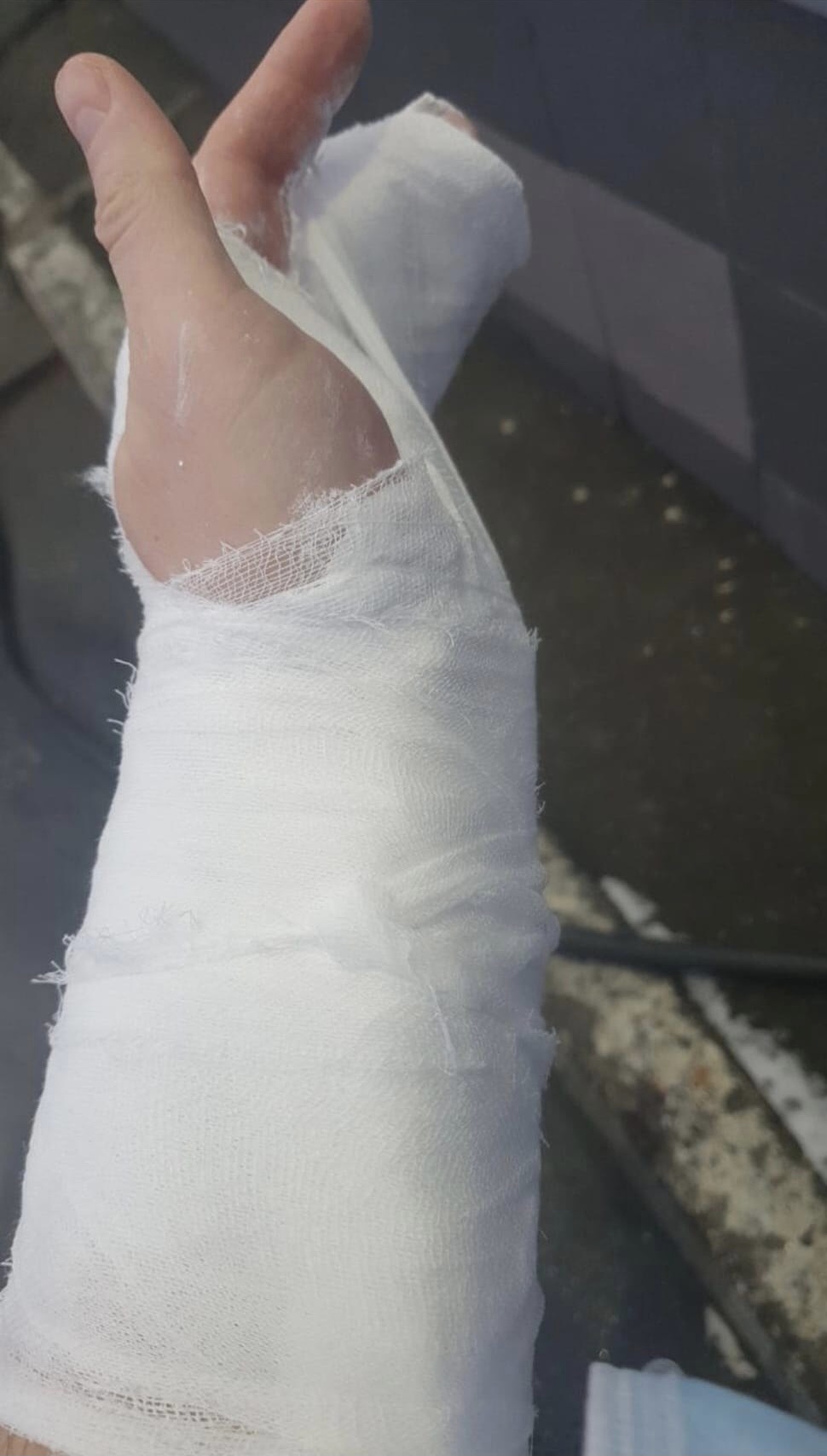 Он показал фото, на котором у него после конфликта с охранником рука находится в гипсе.