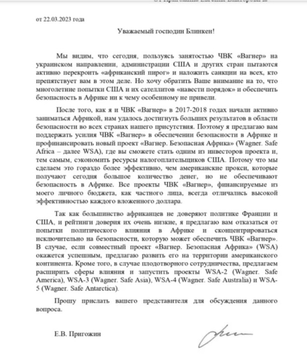 Напередодні російські ЗМІ повідомляли, що Пригожин нібито написав листа держсекретарю США Ентоні Блінкену, в якому запропонував профінансувати діяльність його організації на території Африки, заявивши, що його ПВК “вдалося досягти значних результатів у сфері безпеки в усіх країнах, де вона побувала” .